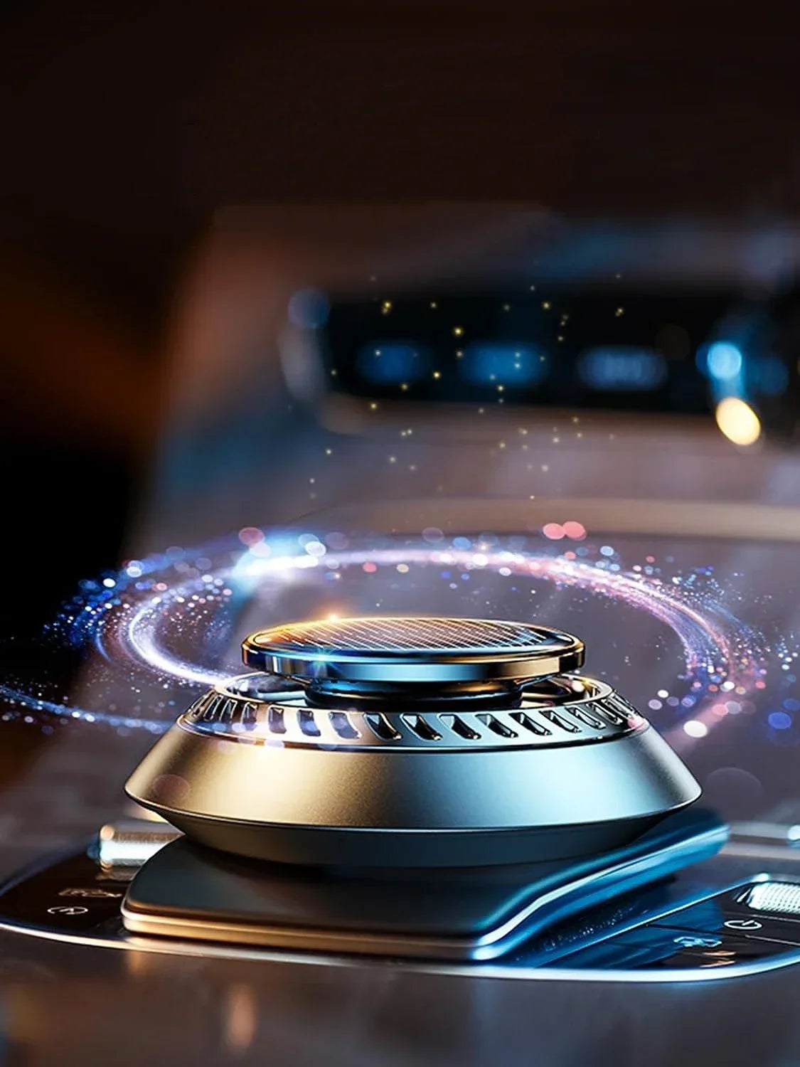 Fabriqué avec une coque en alliage et ABS, ce modèle se fixe facilement sur le tableau de bord à l’aide d’un adhésif automobile sans trace. Il fonctionne sans fil ni piles, avec un moteur solaire ultra-silencieux (<30–36 dB)